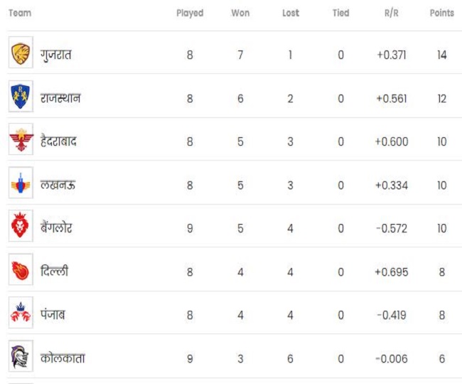 The group of Gujarat, running in incredible cadence, stays at the highest point of the focuses table. The group's triumph against Hyderabad was the seventh progress in 8 matches and presently Hardik Pandya's group has 14 focuses. Rajasthan group has 12 marks of 6 successes after a similar number of matches and the group is at number two. Indeed, even after the loss from Gujarat, the group of Hyderabad stays in the third spot. It has 10 focuses from 5 successes after 8 matches. KL Rahul's new group, Lucknow Super Giants, is at the fourth situation with 10 focuses from 5 successes after 8 matches.